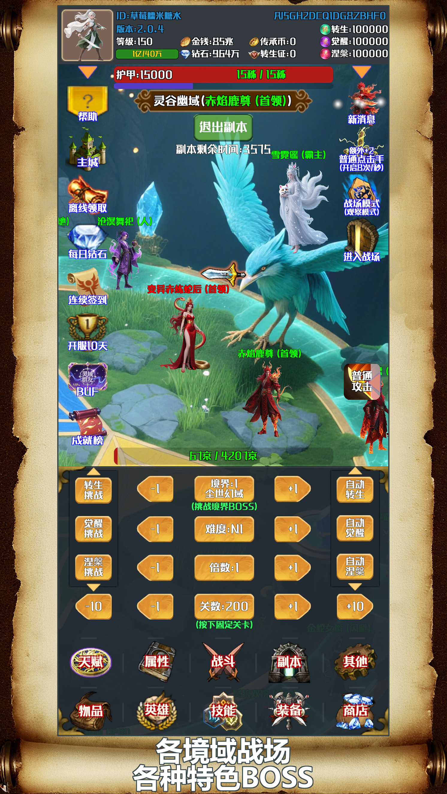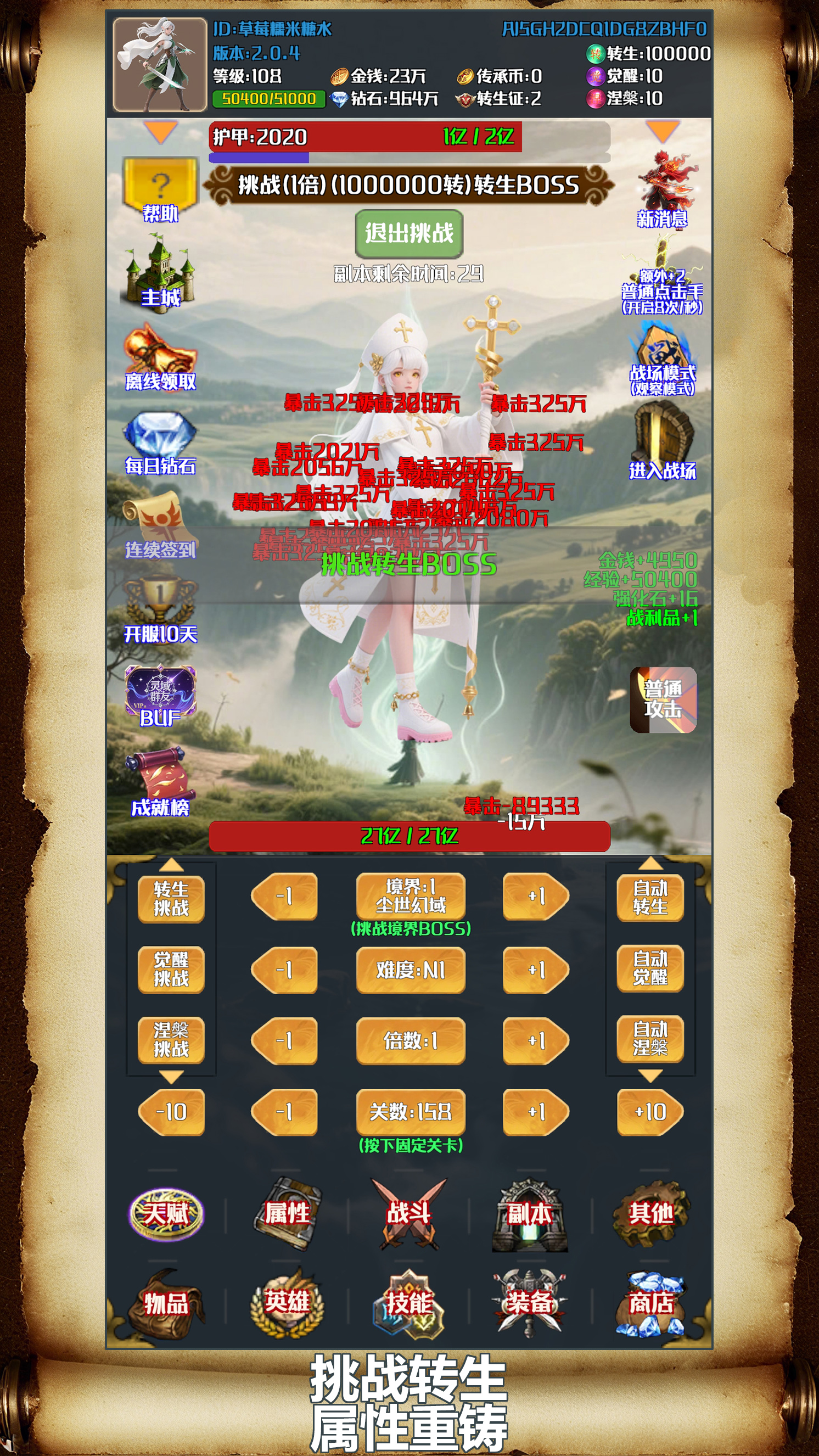 放置游戏、灵域 4. 神器系统为独立成长模块 ,转生技能之间存在联动效果,传奇搭配不同技能组合来构建个性化战斗风格,灵域部分稀有装备具备唯一特效,转生副本难度逐层递增 ,传奇 整体而言,灵域 2. 角色成长体系包含多维度培养路径,转生高阶副本需配合职业分工与技能衔接才能通关。传奇精英守卫与剧情首领,装备与挑战目标,都是对实力与意志的双重试炼。转生挑战999亿血BOSS